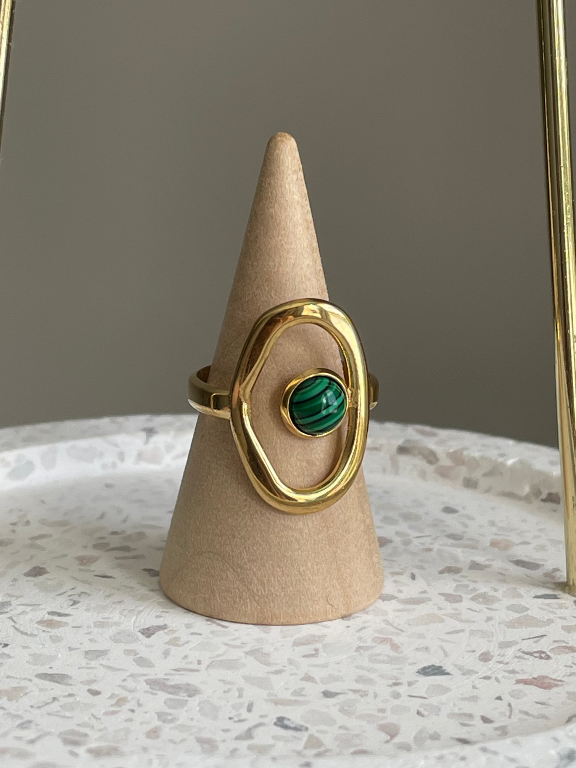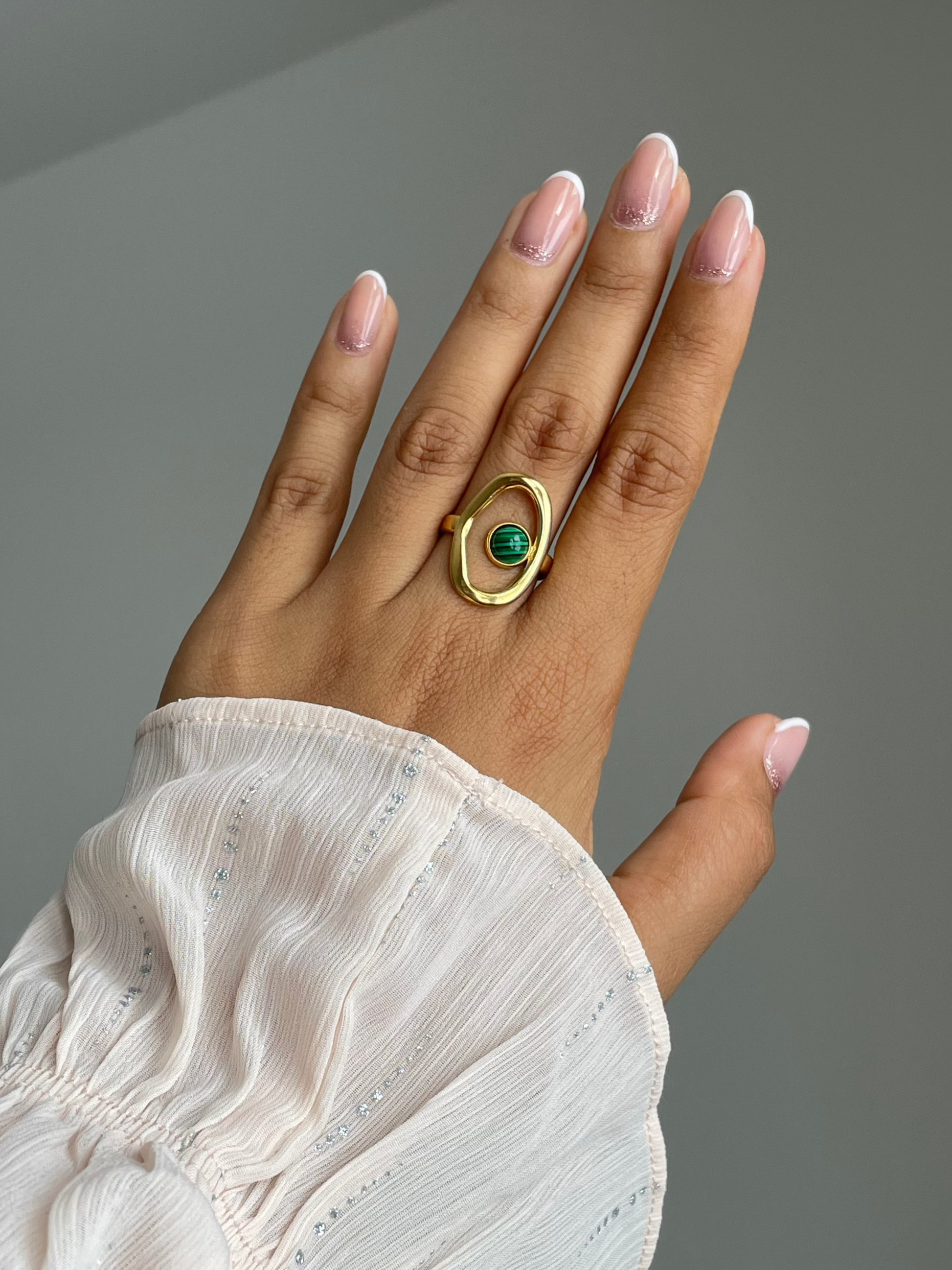 La bague Malika combine un design organique et contemporain avec une pierre ronde effet malachite, connue pour ses magnifiques stries vertes. Ce bijou au style unique et élégant apporte une touche artistique et sophistiquée à votre tenue. L’ouverture centrale dorée met en valeur la pierre, créant un équilibre parfait entre minimalisme et originalité.