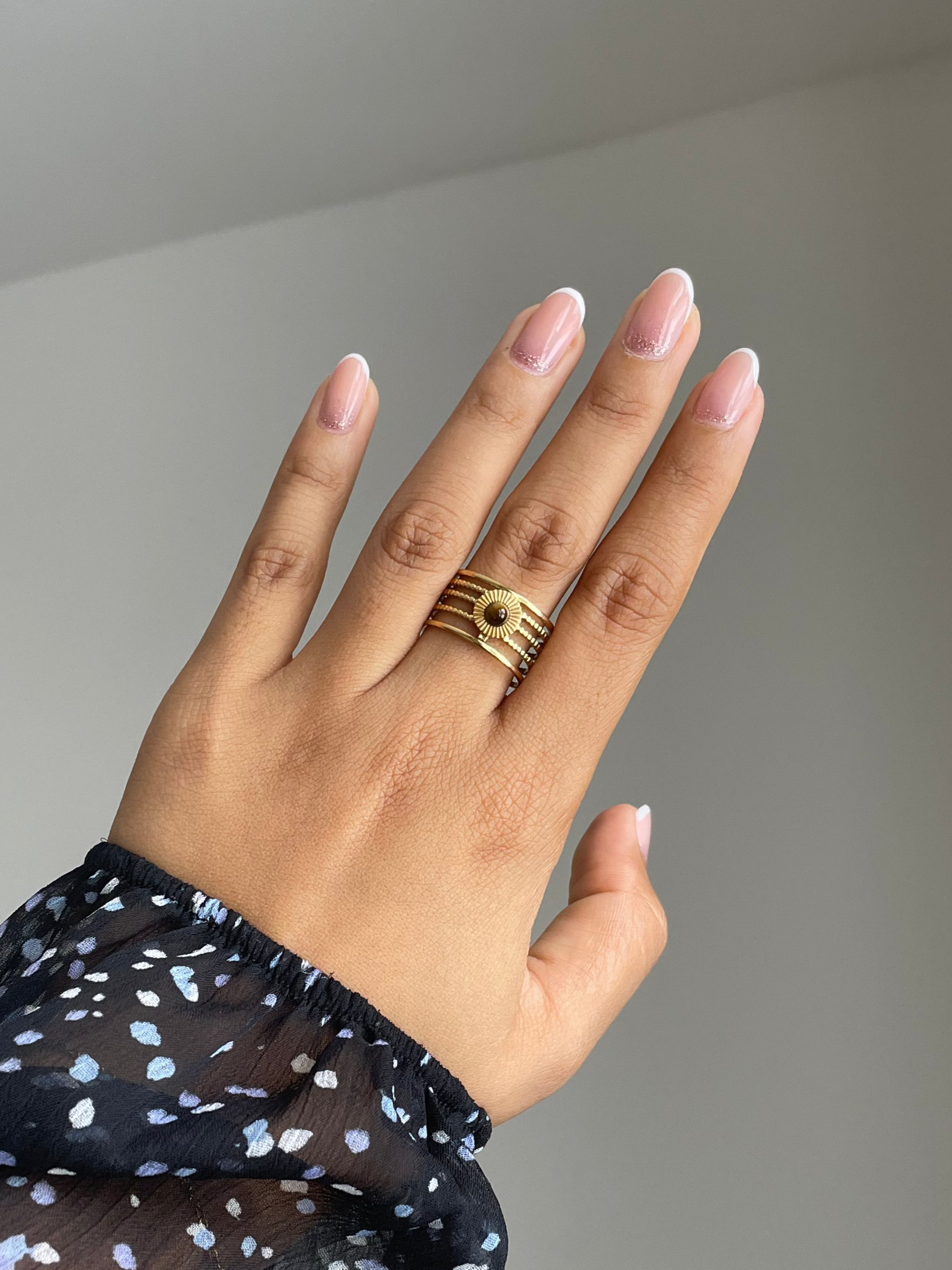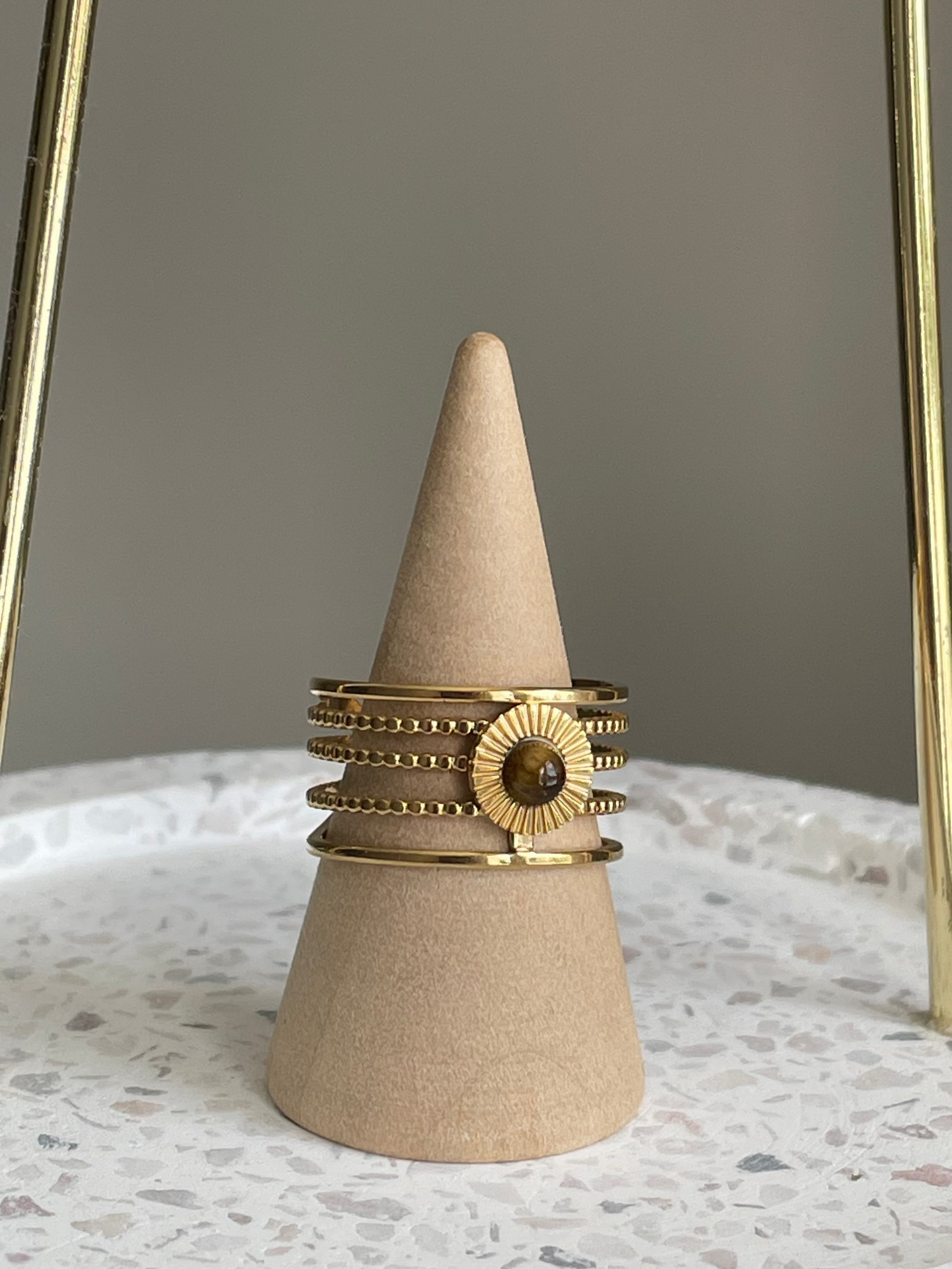 Sublimez votre style avec la bague ajustable Soleia, ornée d’une pierre naturelle œil de tigre miniature, symbole de protection et de force. Son design en strates dorées rappelle les rayons du soleil, faisant de cette bague un bijou à la fois chic et intemporel.