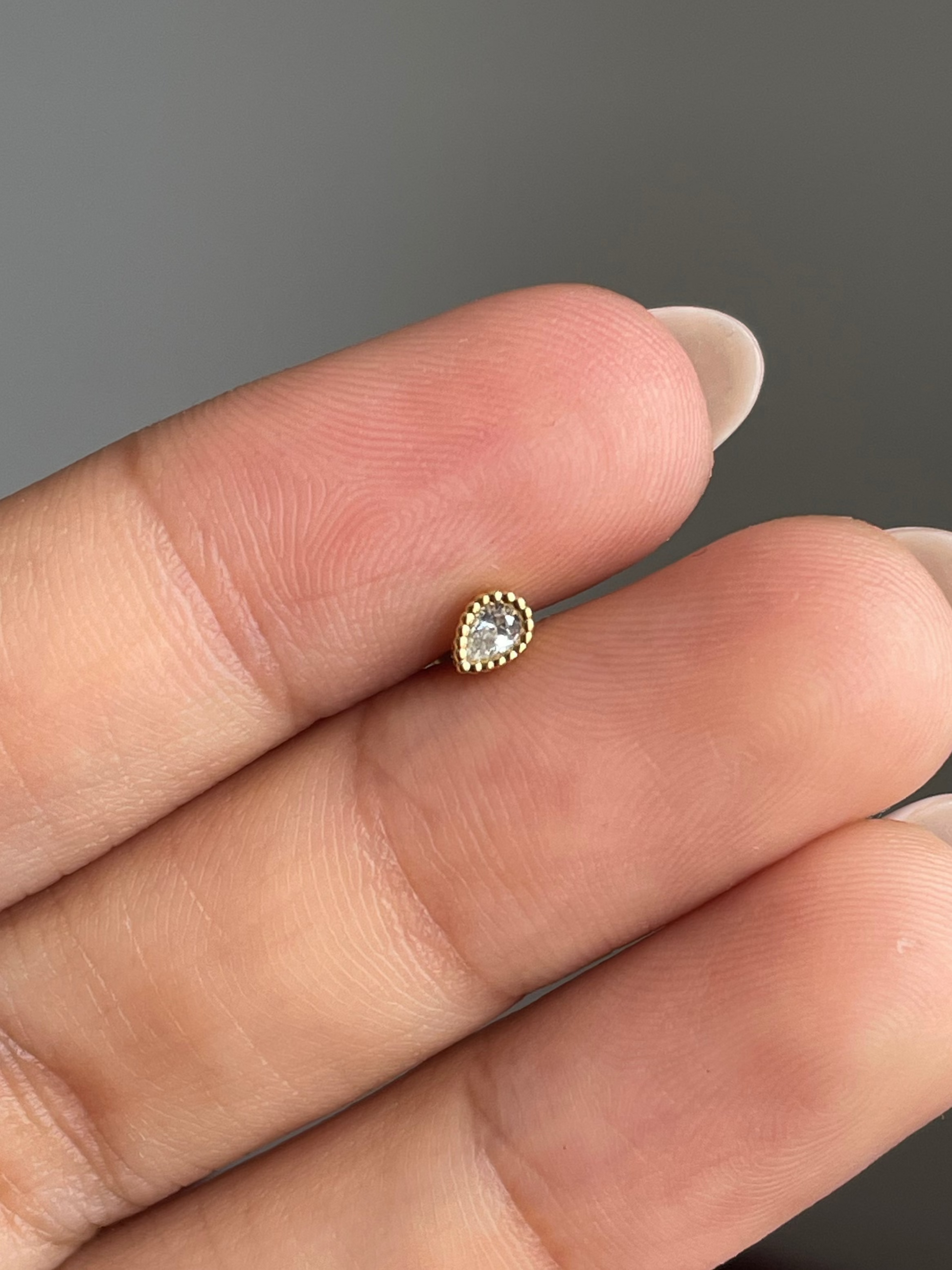 Minimaliste et raffiné, le piercing "Tina" se distingue par sa pierre en forme de goutte, délicatement entourée d’un cadre doré texturé. Conçu pour illuminer subtilement votre oreille ou votre cartilage, il est parfait pour un look chic.
